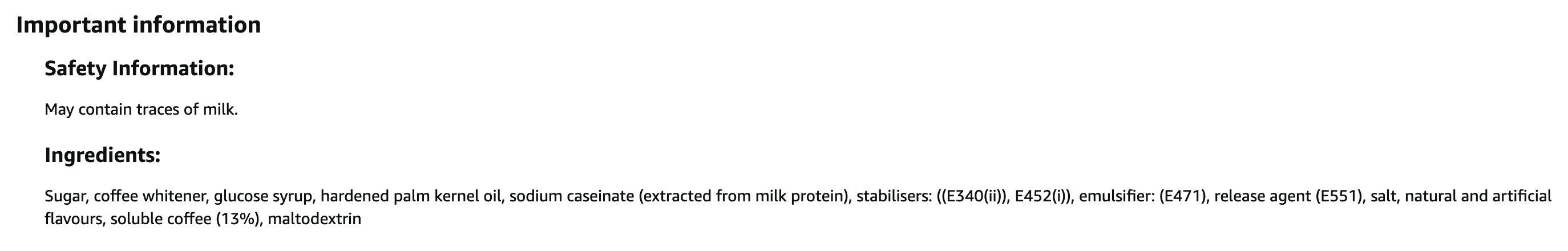 Looking at the ingredient list: sugar, coffee whitener, glucose syrup, hardened palm kernel oil.