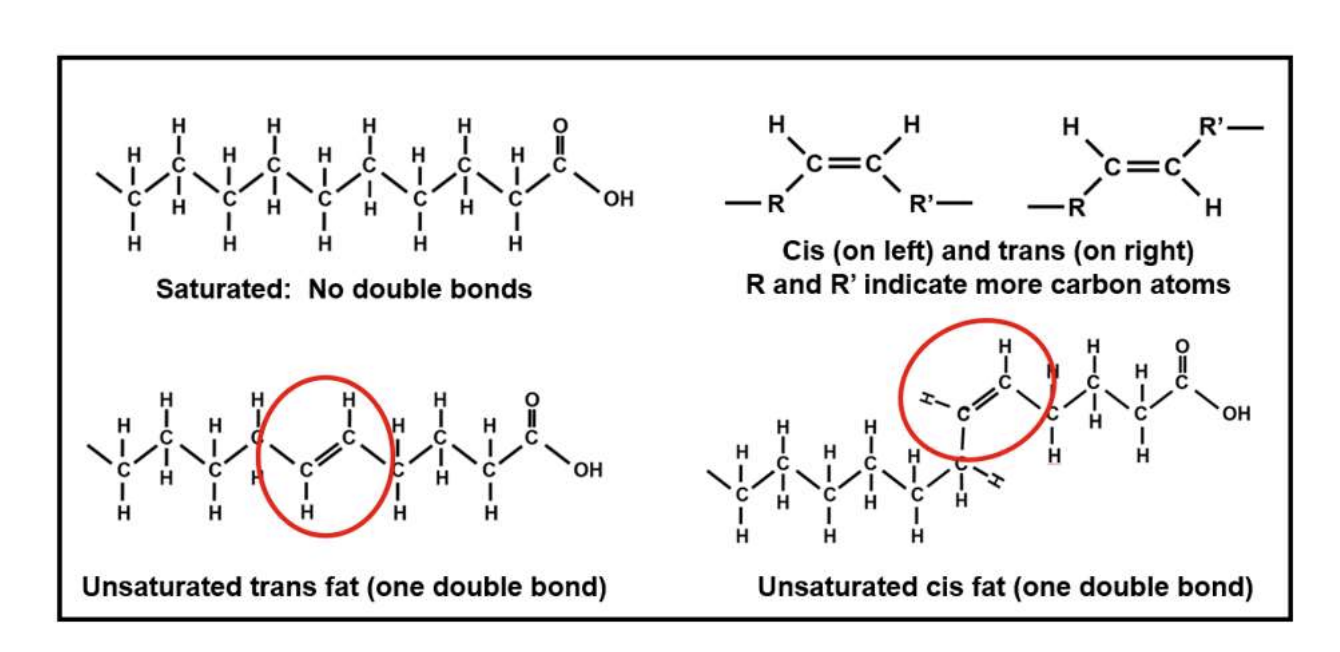 Fig. The difference between saturated, cis, and trans fats (Image ref [1]).